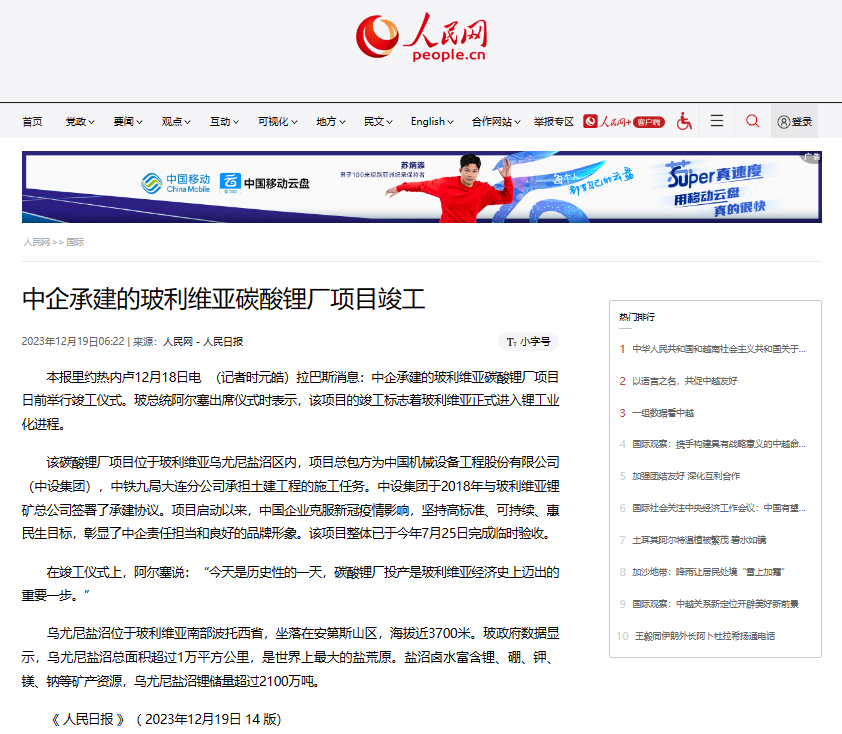 人民日?qǐng)?bào)報(bào)道國機(jī)工程集團(tuán)總部(中設(shè)集團(tuán))總承包項(xiàng)目——玻利維亞碳酸鋰廠啟動(dòng)以來,克服新冠疫情影響,堅(jiān)持高標(biāo)準(zhǔn)、可持續(xù)、惠民生目標(biāo),彰顯了中企責(zé)任擔(dān)當(dāng)和良好的品牌形象。